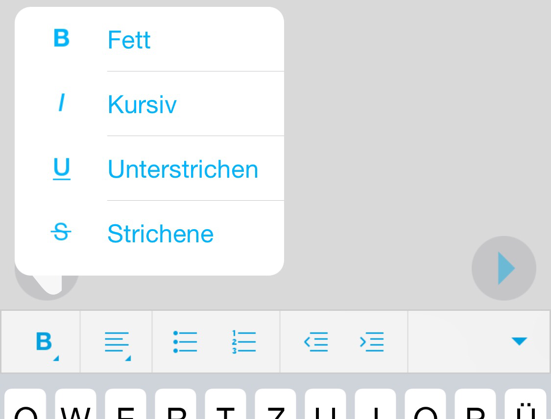 • Durchstreichen als Formatierung wird angeboten, funktioniert aber nicht (und heisst im Menü «Strichene»).